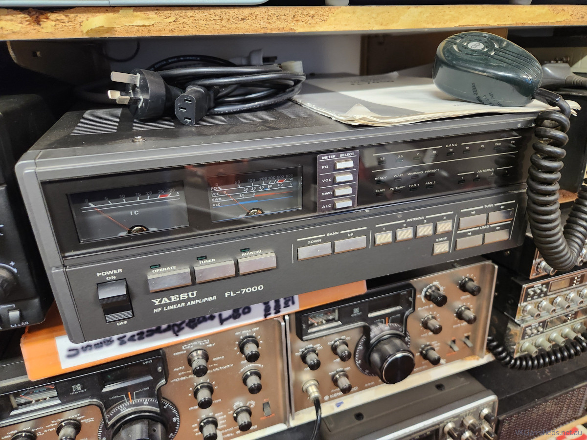 Second Hand Yaesu FL-7000 HF Linear Amplifier,The FL-7000 is a microprocessor-controlled, all solid state linear amplifier with built in power supply and automatic antenna tuner, providing up to 1.2 kilowatts RF input power on the 160- through 10- metre HF ham radio bands, including the WARC bands. Super fast T/R turnaround timing allows the FL-7000 to be used for QSK CW, HF packet radio and even AMTOR with an exciter so designed. Requiring only 70 watts of excitation for full output, four transistors with 300W collector dissipation each are combined in a full y protected push-pull parallel wideband ?no-tune? amplifier circuit, powered by a heavy duty regulated 47V, 25A DC power supply and cooled by a bottom mounted fan through Yaesus own DVC(Direct Vertical Cooling) heat sinking system. A high-power, low-loss automatic internal antenna automatically rematches the antenna whenever SWR exceeds 2:1.