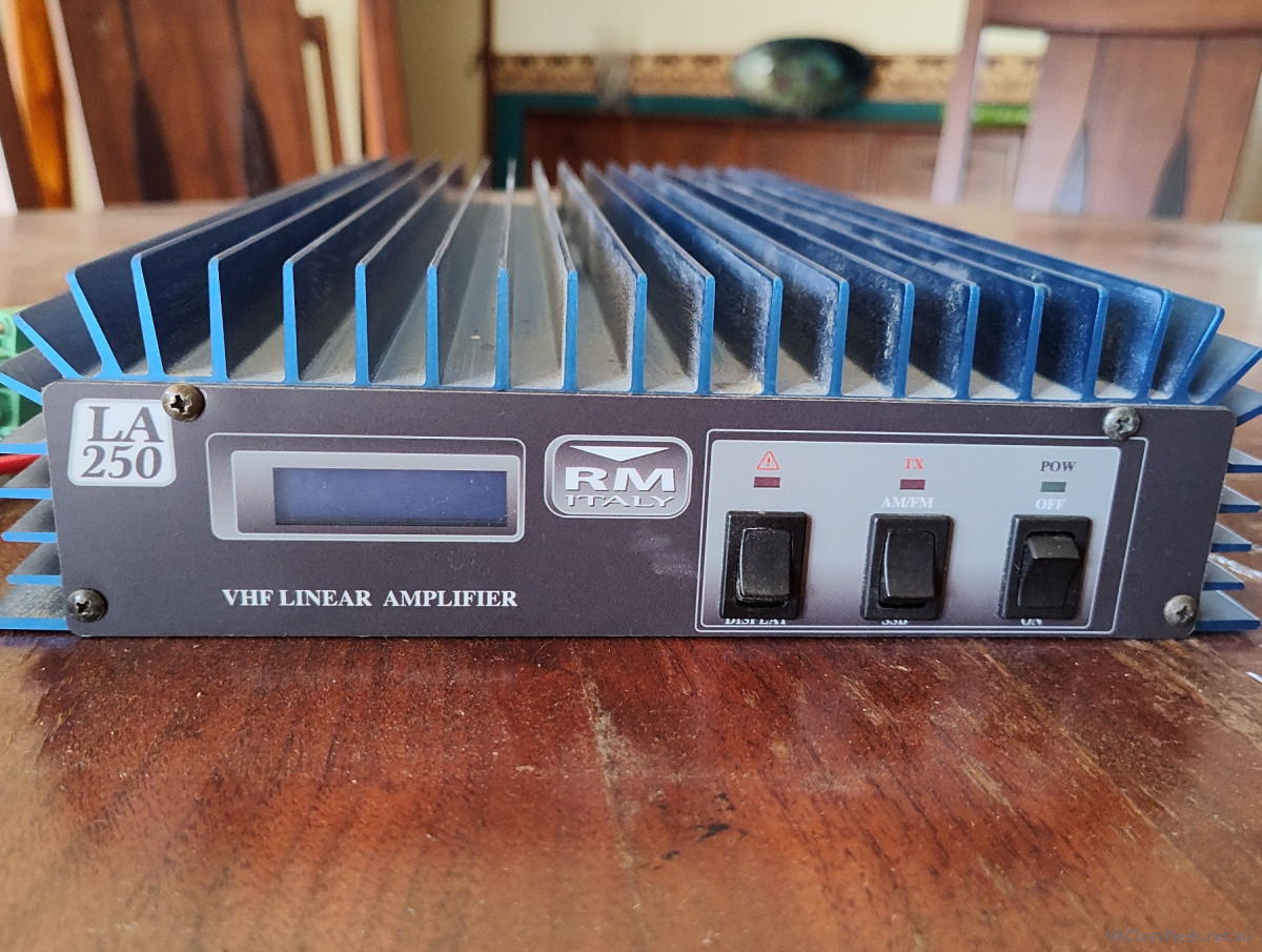 The RM Italy LA 250 V is a 200W solid-state linear amplifier designed for the 140–150 MHz (2m) VHF band, requiring 13.8 VDC and 1-20W input. It features an LCD display, automatic TX/RX switching, and protection against high SWR, over-temperature, and excessive input power.