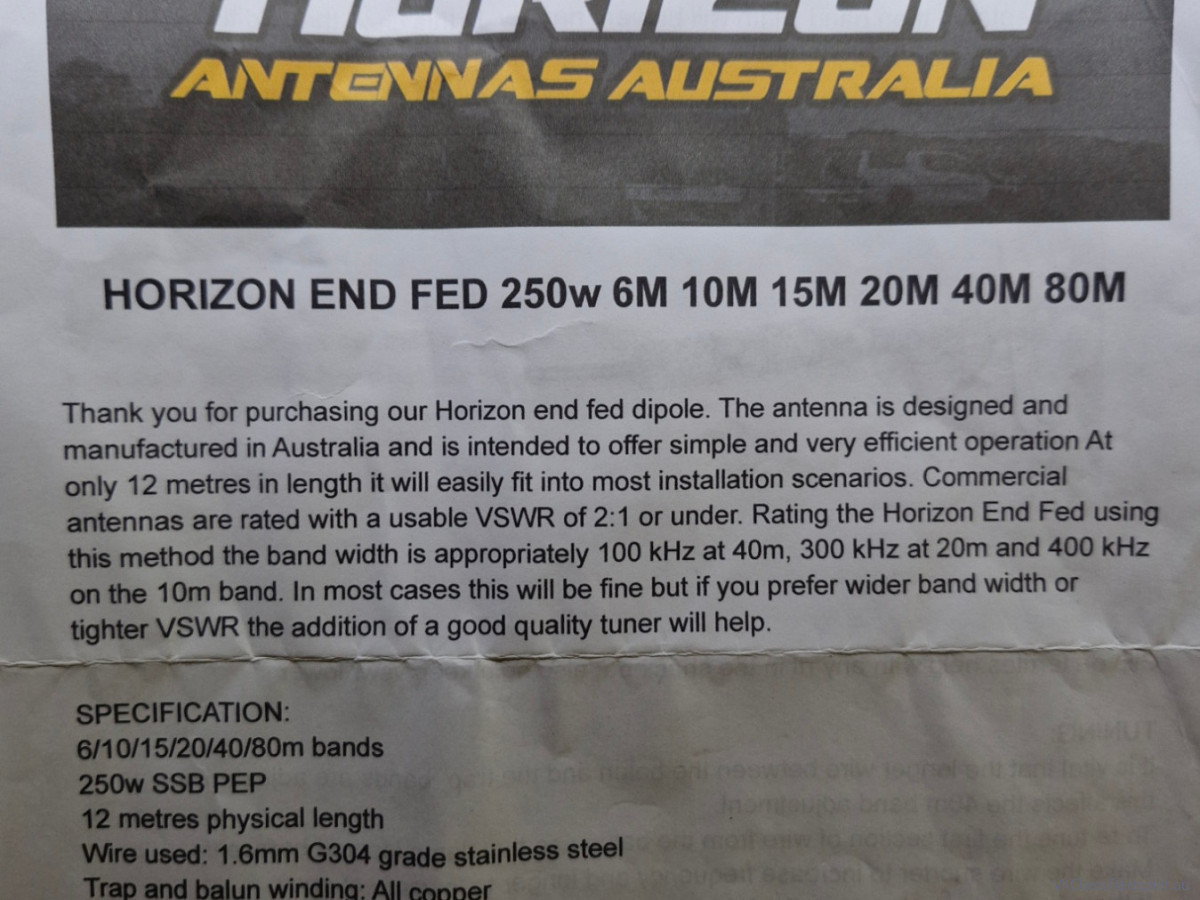 For Sale is my Horizon Multiband endfed Wire Antenna, handles 250 watts and goes from 6 metres to 80 metres and is great for small blocks as it is only 12 metres long.