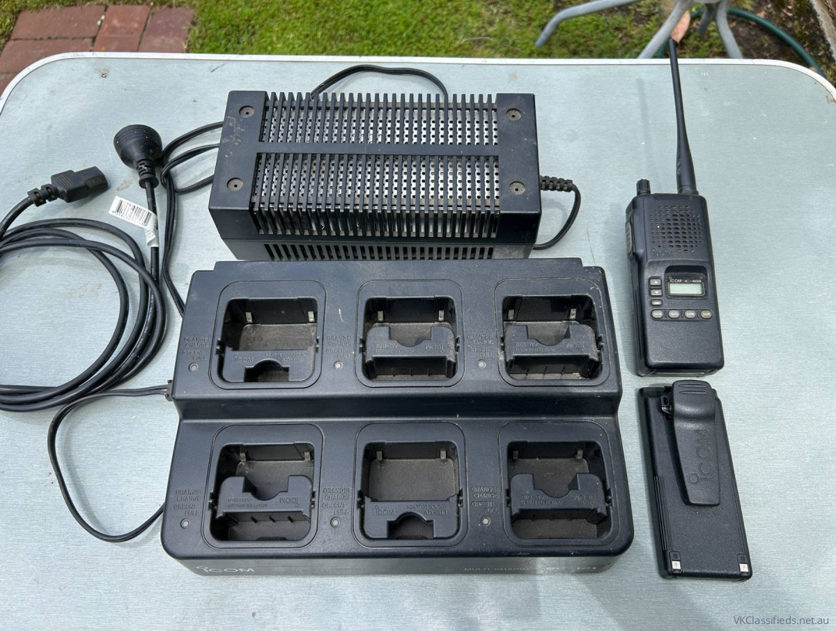 Older Icom IC40S handheld UHF Cb radio, comes with six bay charging unit with power supply, ha two NiCD batteries that I assume are no good.