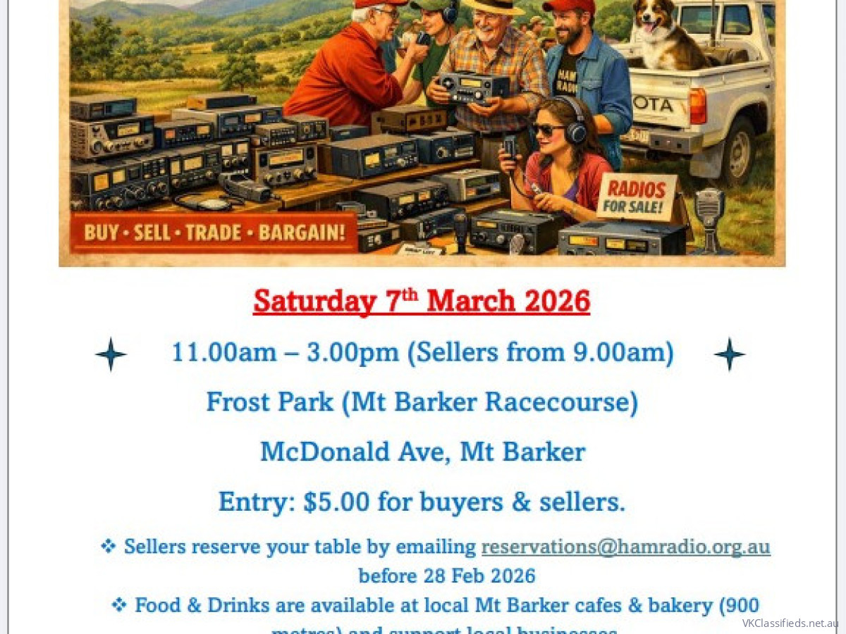 Seller registrations are starting to come through and thank you to those who have registered. If you’re planning on having a table to sell, please register by email to [reservations@hamradio.org.au] as soon as you can.