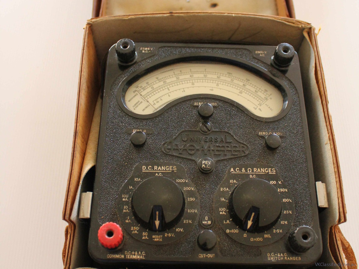 Vintage Universal Avometer Model 8 mk3 in fair condition. Battery compartment is clean but signs of mild corrosion removal. I removed what I thought was corrosion but I actually found that it was blue paint to mark the negative terminal! Requires stand "D cell" and a 15v battery (available online sites). Plastic case appears to be have been broken and repaired (Please contact me for further pix of this). The Rear instruction plate is scratched but quite readable – see picture. No test leads but uses standard 4mm banana plugs. Quickly tested on Ω range, DC volts using 1.5 and 9 volt batteries and AC volts using 0 -250v variac – all seems OK but no warranty expressed or implied. Carry Case is in fair condition for age and needs re-stitching – see pictures for detail. Pickup in Ocean Reef / Joondalup WA Or post at buyers’ cost, probably around $22