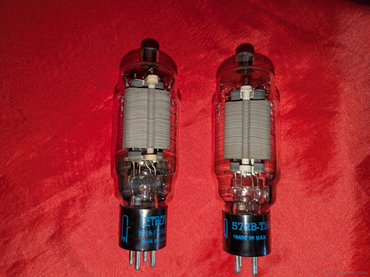 For sale are genuine Cetron 572B valves. These are the proper Cetrons that have become increasingly hard to find in strong testing condition. Both tubes test well with plenty of life left. Easy 600 watts plus in my Yaesu FL-2000B amplifier, shown on Telepost LP-100 Watt Meter.