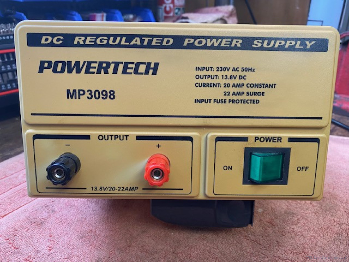Powertech model MP3098, 20 Amp power supply in good working condition. The plastic front panel has yellowed. (see photo)