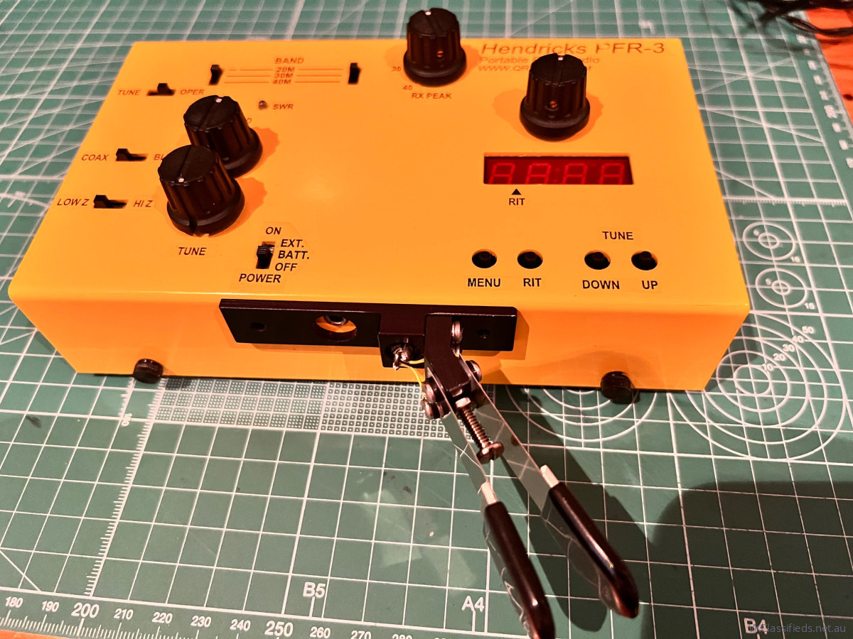 Hendricks PFR-3 “Portable Field Ready” QRP CW transceiver covering the 40/30/20meter bands. 5 watts at 12 volts all bands and a little less on internal batteries, current draw 650-750ma typical at 5 watts, receiver MSD 0.2 uV typical, selectivity 300Hz, four crystal IF filter, 5-40wpm internal iambic keyer, coax or balanced line with a built in balanced line tuner, external power or internal AA battery option. Complete with original Hendricks paddles (rudimentary but they work!) A fun little radio perfect for the shack or the caravan or the camp site. In very good condition with some paperwork.