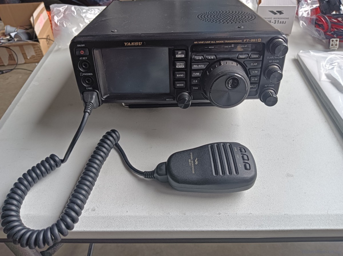 Yaesu FT 991A in original box with purchase receipt in excellent condition HF, 6m, 2m and 70cm bands, microphone has been modified with a condenser mic insert for improved fuller more drive audio to Peter VK3YE design. (See You Tube video online.)