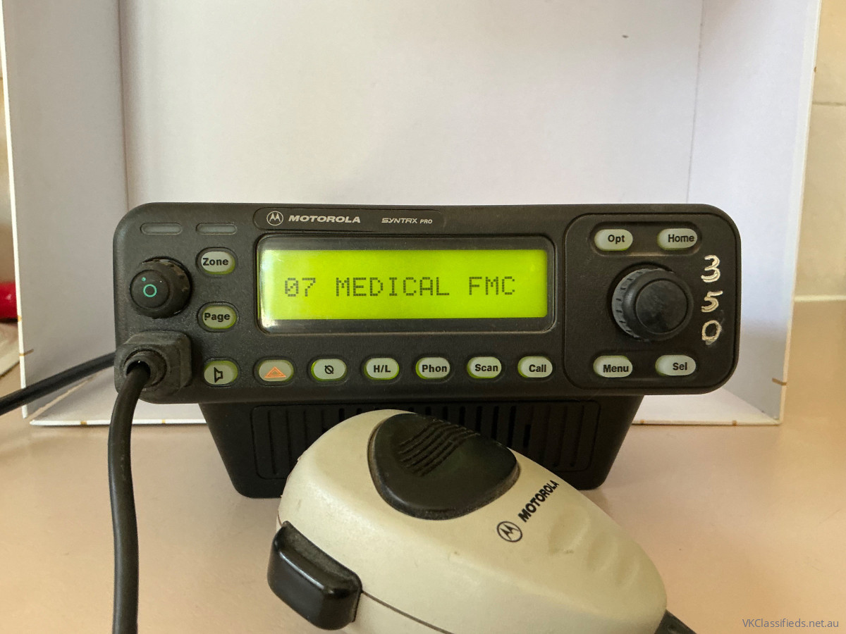 Motorola syntrx pro with base tray and microphone. I believe it's 403-470MHz. Light gauge power cable only, not suitable for TXing . Appears to have old GRN programming. Appears to work but no further testing done.